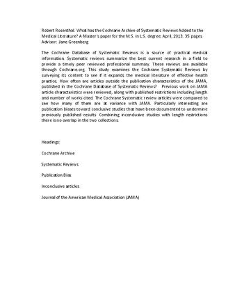What has the Cochrane Archive of Systematic Reviews Added to the Medical Literature? | June 14, 2013 | Public | Download |